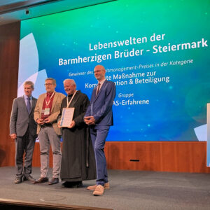 Die Lebenswelten der Barmherzigen Brüder erhält den Umweltmanagement-Preis für ihr umfassendes Nachhaltigkeitskonzept, das ökologische Verantwortung, soziale Teilhabe und kreative Mitgestaltung vereint. Mit der Umsetzung des Konzeptes bildet die Tageswerkstätte Jakobus ein Vorbild für andere Einrichtungen.