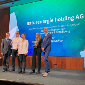 Naturenergie erhält den Umweltmanagement-Preis für ihren Neophytenhalbtag, eine Mitarbeitenden-Aktion mit wachsender Beteiligung (zuletzt über 50 Personen). Beim Neophythenhalbtag entfernen Mitarbeitende gemeinsam invasive Pflanzen rund um die Standorte. Die Initiative stärkt das Umweltbewusstsein und fördert die Artenvielfalt in der Region.